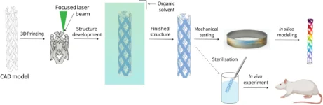 The schematics present the study workflow. First, CAD models of stents were generated. The printing process followed, with the goal of preparing structures for mechanical and biological testing. Additionally, cylinder samples were prepared from the same material as the stents. Mechanical testing was performed in two steps – experimental material characterization and in silico modeling. Finally, stents were validated using rats in vivo.