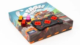 Crash Derby lets you become an off-road warrior, navigating your vehicle across a dangerous map to collect flags and power-ups while plowing into your competitors. The map is made of cardboard hexagon tiles (naturally), as are the pieces you collect to upgrade your vehicle. The tokens you pick up during game play are slotted into your “steering wheel,” piece which is made up of three gears that are spun with each turn.